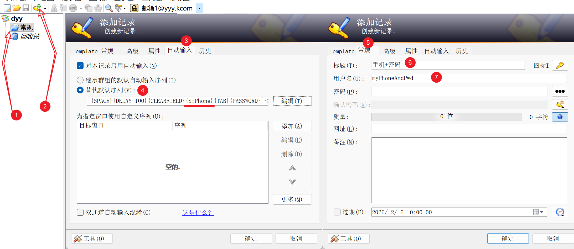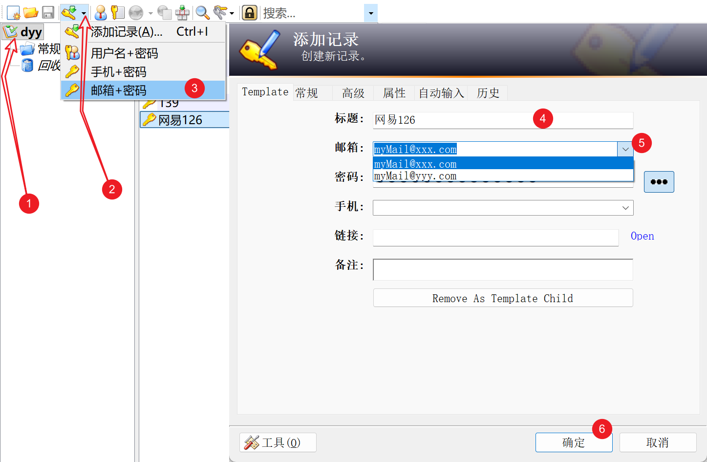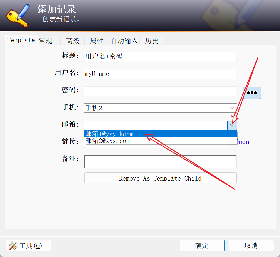 然后我们创建密码记录时,就可以选择〔手机〕和〔邮箱〕了,如下👇: