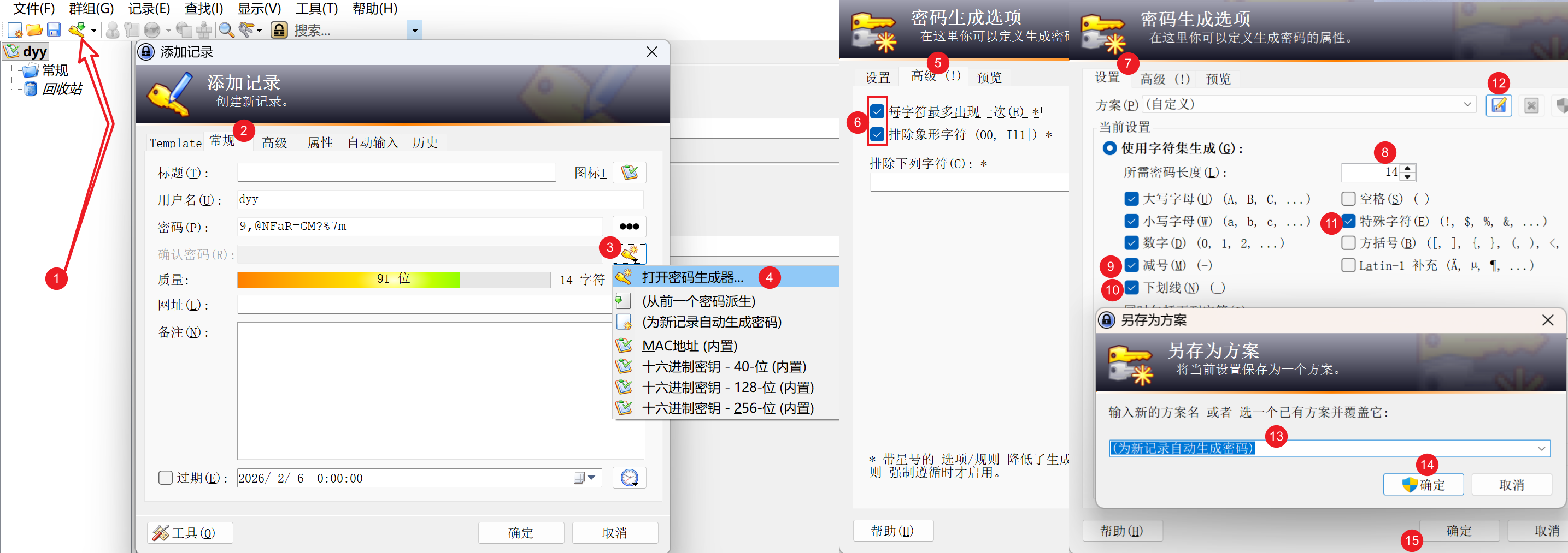 之后在该数据库中生成的密码记录将自动继承这个输入规则,除非你在添加记录时进行了额外的指定。