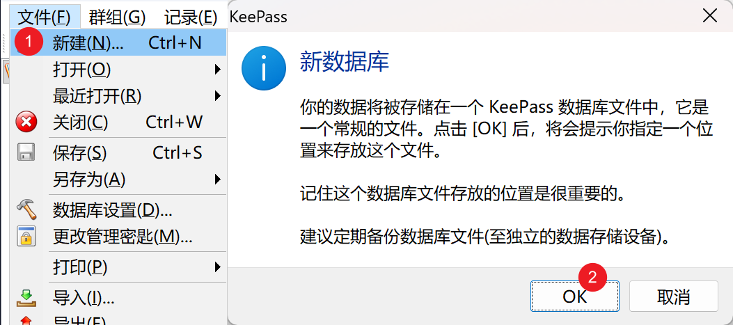 Keepass 的密码数据存储与数据库文件(.kdbx)中,所以我们在使用Keepass前,需要首先创建一个用于储存与管理密码的数据库。