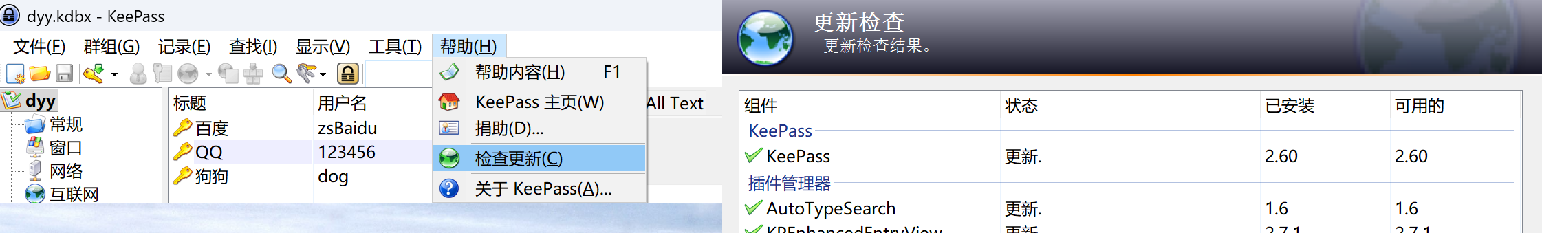 插件安装完成后,重启 Keepass ,即可以通过〔帮助〕/〔检查更新〕来查阅各插件是否有更新版本,如下👇: