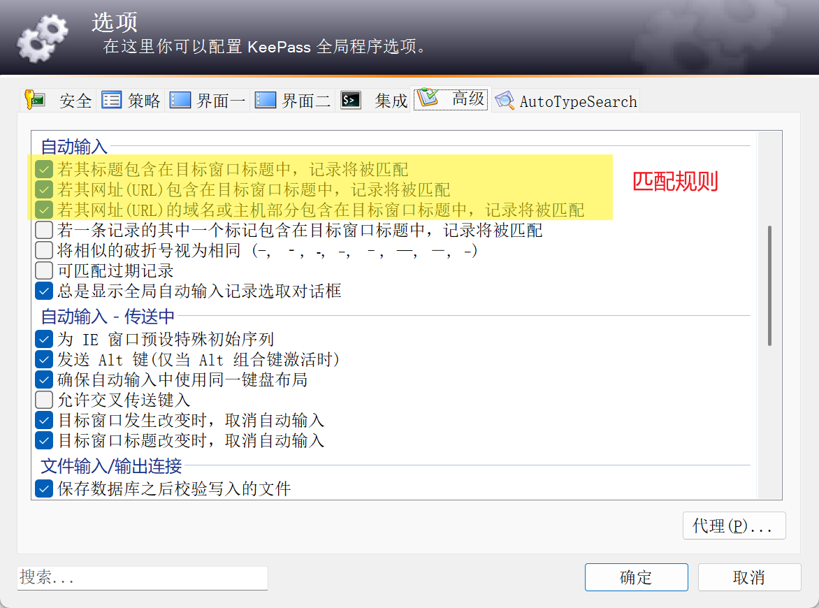当用户在某一个应用程序中触发Keepass 的全局热键后,Keepass 会获取当前应用的标题,然后在数据库中查找应用应用满足要求的记录。并将这条记录键入到目标应用的输入框中。那么,什么样的记录算是满足要求的记录呢?这是在Keepass 的〔工具〕/〔选项〕中设置的,如下👇: