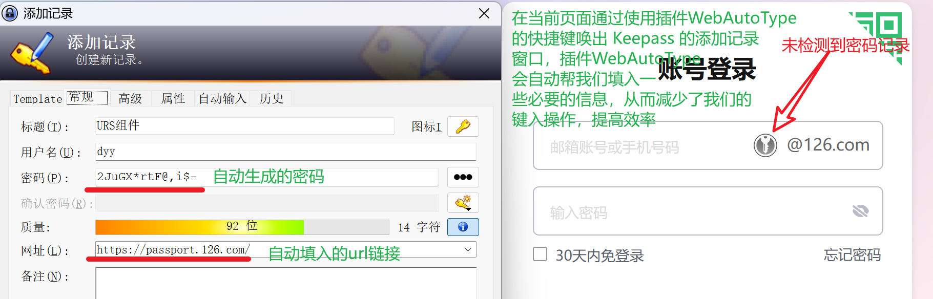 这个插件可以让你在网页中唤出Keepass 的添加记录对话框,它可以自动的帮你填入一些信息,例如url ,例如标题等,如下👇: