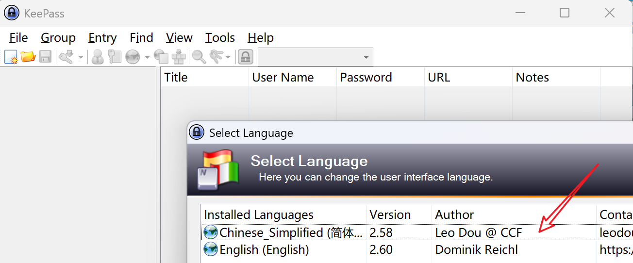 然后重启 Keepass ,便可以选择中文界面了(选择中文语言后,会提示重启),如下👇