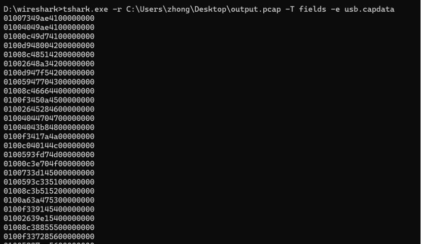 步骤五: 利用 tshark 工具提取数据包中的 usb.capdata 字段,获取原始十六进制数据