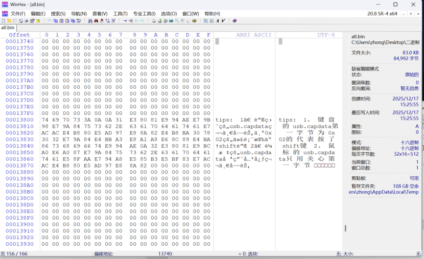 步骤四: 使用 WinHex 工具打开拼接后的 all.bin 文件,识别到 pcap 格式标识(d4c3b2a1)及 USB 数据解析提示