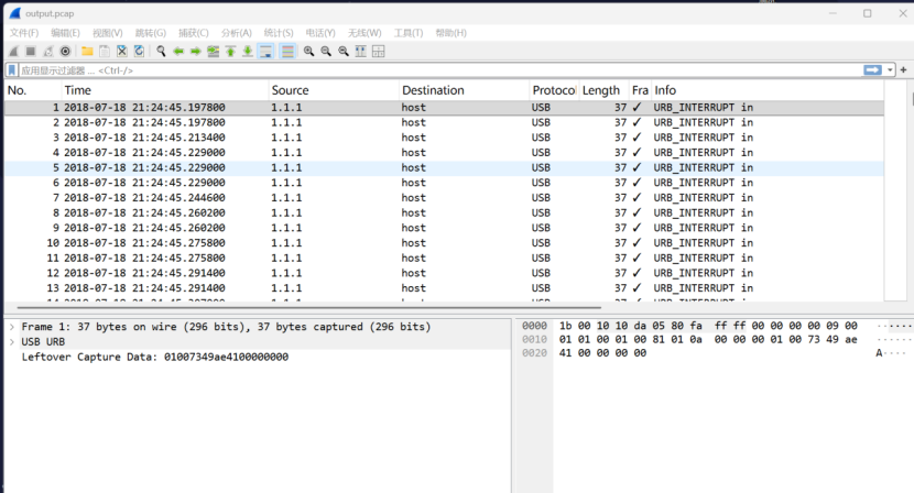 1.****数据包提取法:****使用 tshark 工具从原始数据中提取 USB 设备通信的 usb.capdata 字段,筛选关键通信数据;