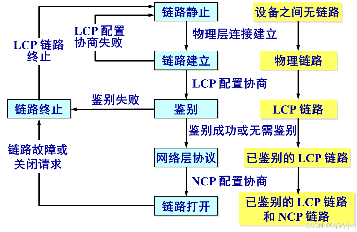- 链路终止:通信完毕时,NCP 释放网络层连接,收回 IP 地址;接着 LCP 释放数据链路层连接;最后释放物理层连接。