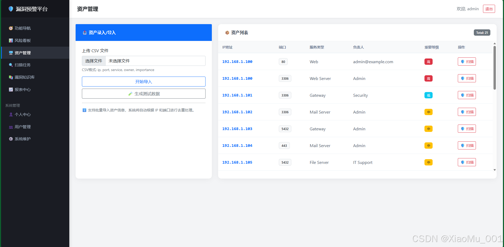 本平台成功实现了从资产录入、自动扫描到风险预警的闭环管理。通过引入资产重要性因子,解决了传统扫描工具"只报漏洞不分轻重"的痛点,为企业提供了一个可视、可控、可管的轻量级安全运营中心 (SOC)。