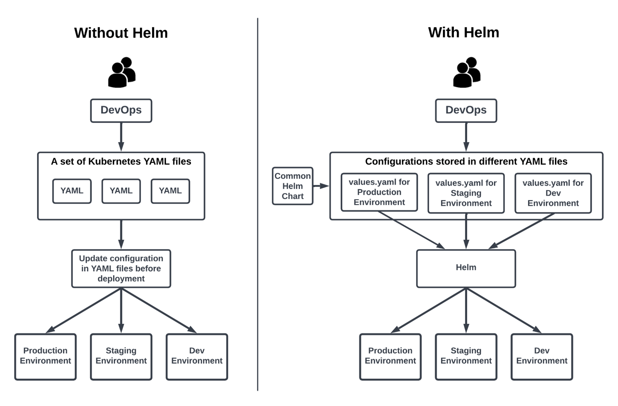 | 配置管理 | 手动编辑/复制 YAML | 模板化,通过 values.yaml 集中配置 |