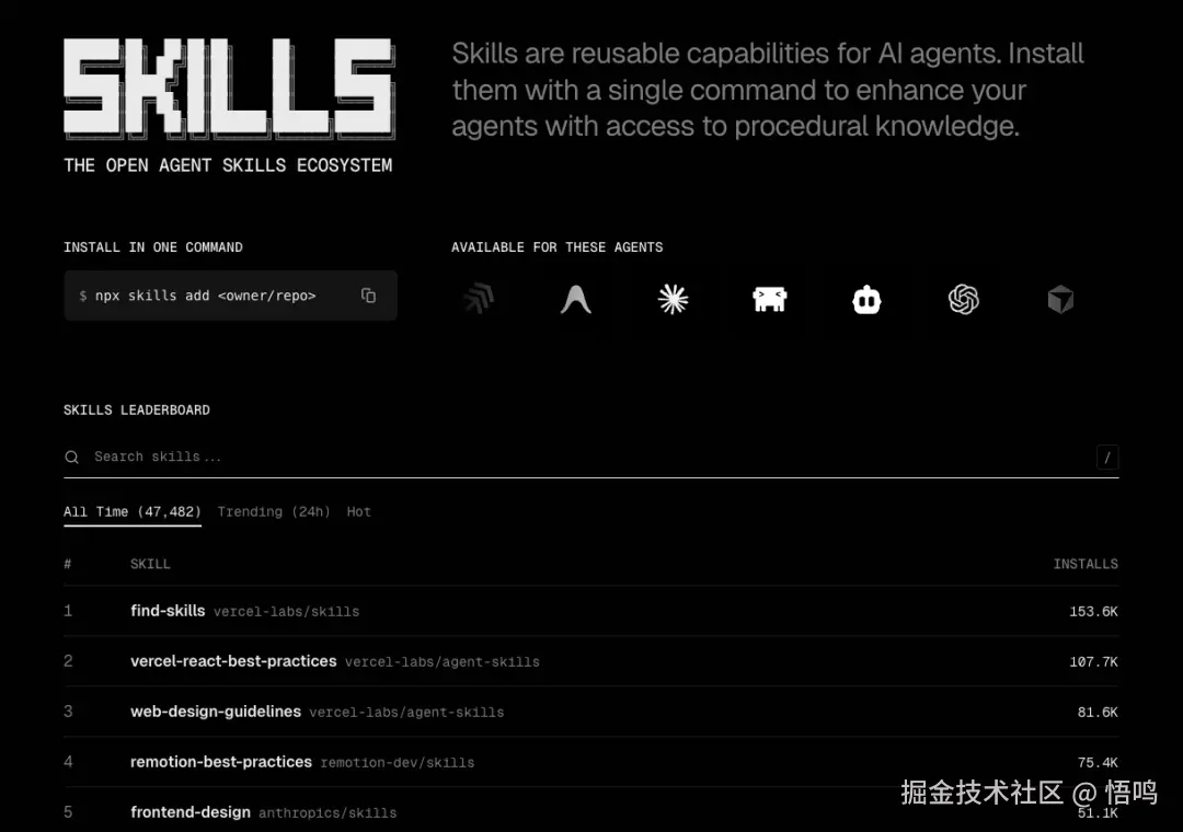 skills.sh/ 这个网站的最大特色就是支持一个指令,自动检测多个知名 Agent,自动一键安装。