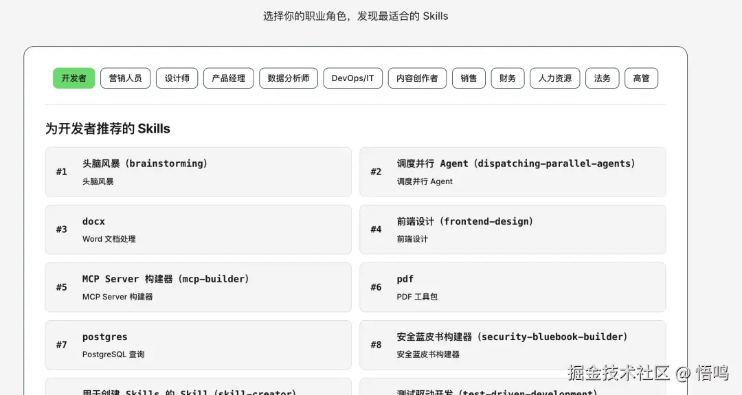这里提供了很多 skills,比较大的特色就是按照岗位进行分类。