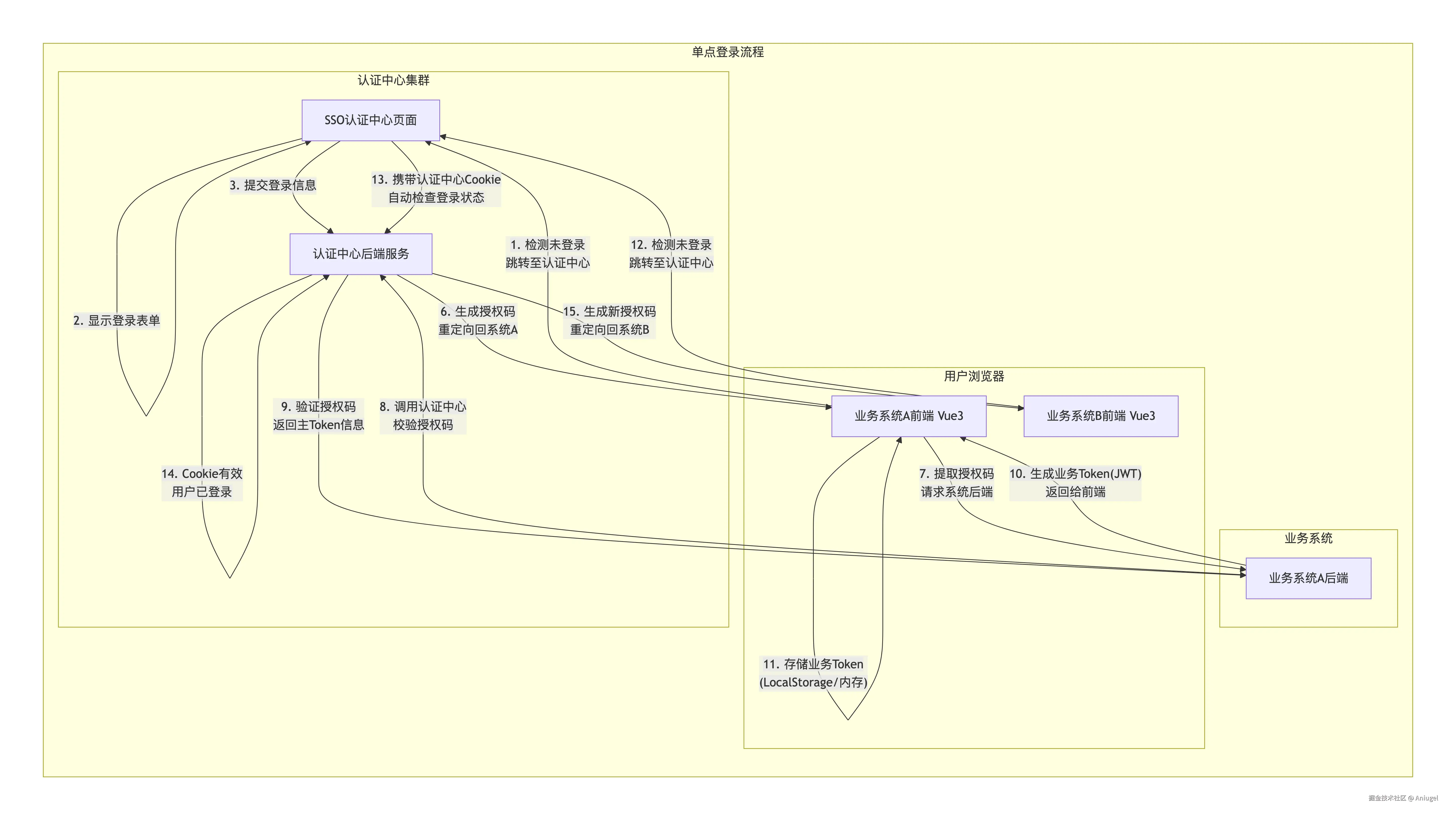 - 后端:认证中心负责生成 sso_token 并存储至自身 Cookie,业务系统负责校验授权码、生成业务临时 token;