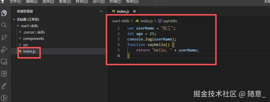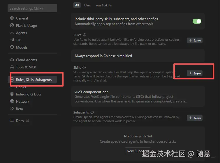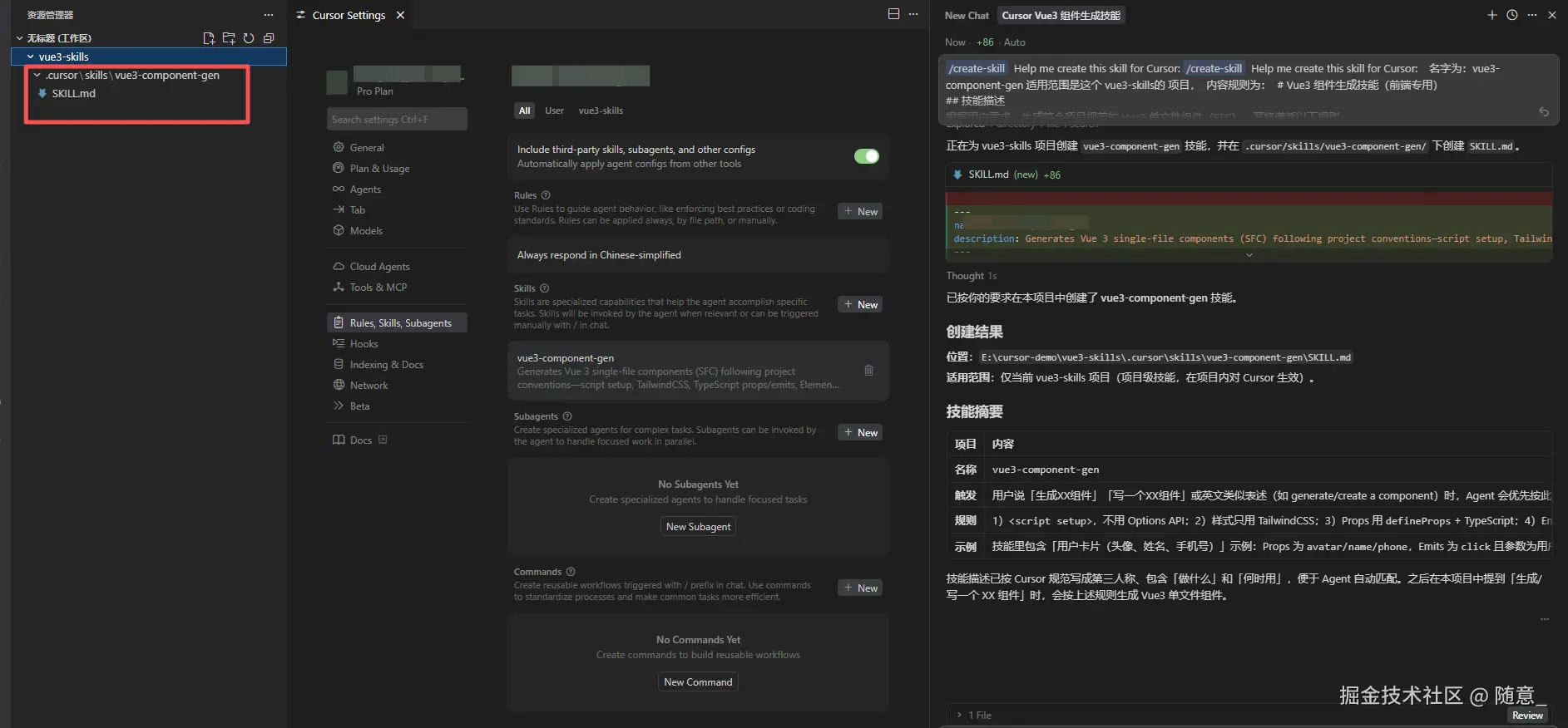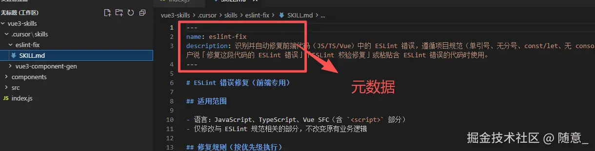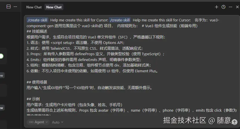 当你输入指令,Cursor 判定需要调用某个 Skill 时(比如输入"生成 Vue3 组件",Cursor 匹配到 vue3-component-gen Skill),才会加载该 Skill 的核心规则------也就是 SKILL.md 中的全部内容(规则、场景、示例等),相当于前端点击某个路由时,才懒加载对应的组件代码。