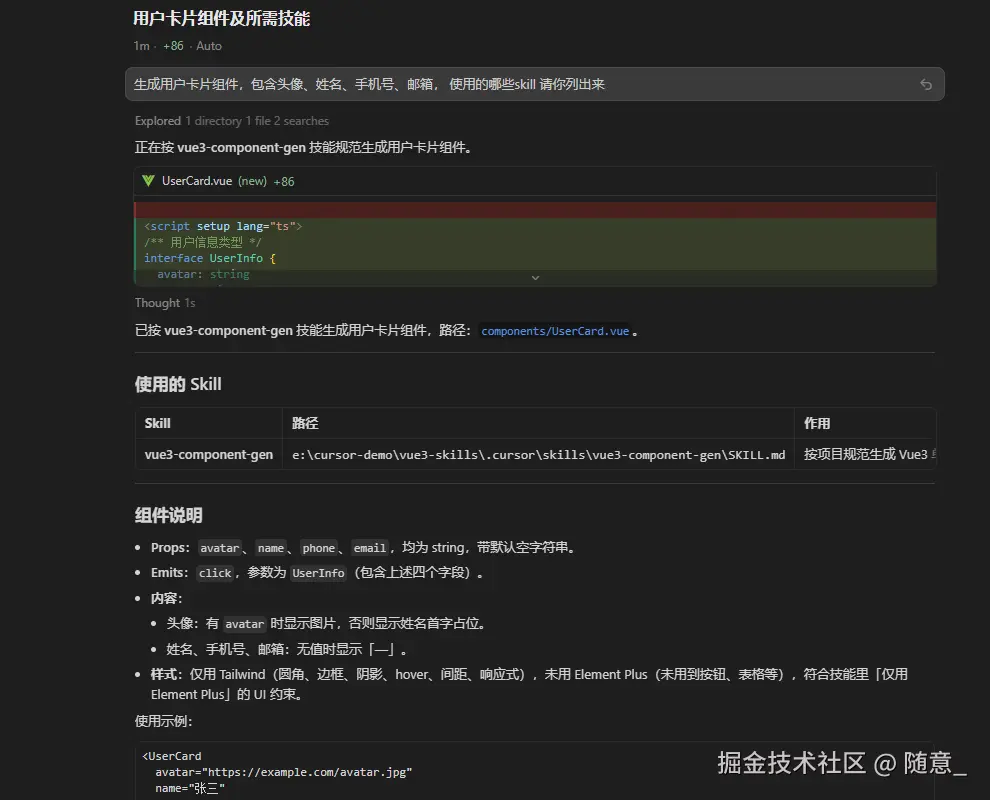 - 省去重复 Prompt:将项目规范、操作流程封装成 Skill,调用时只需输入简单指令(如"生成用户卡片组件"),Agent 就会按照 Skill 中的预设规则执行,无需重复说明细节;