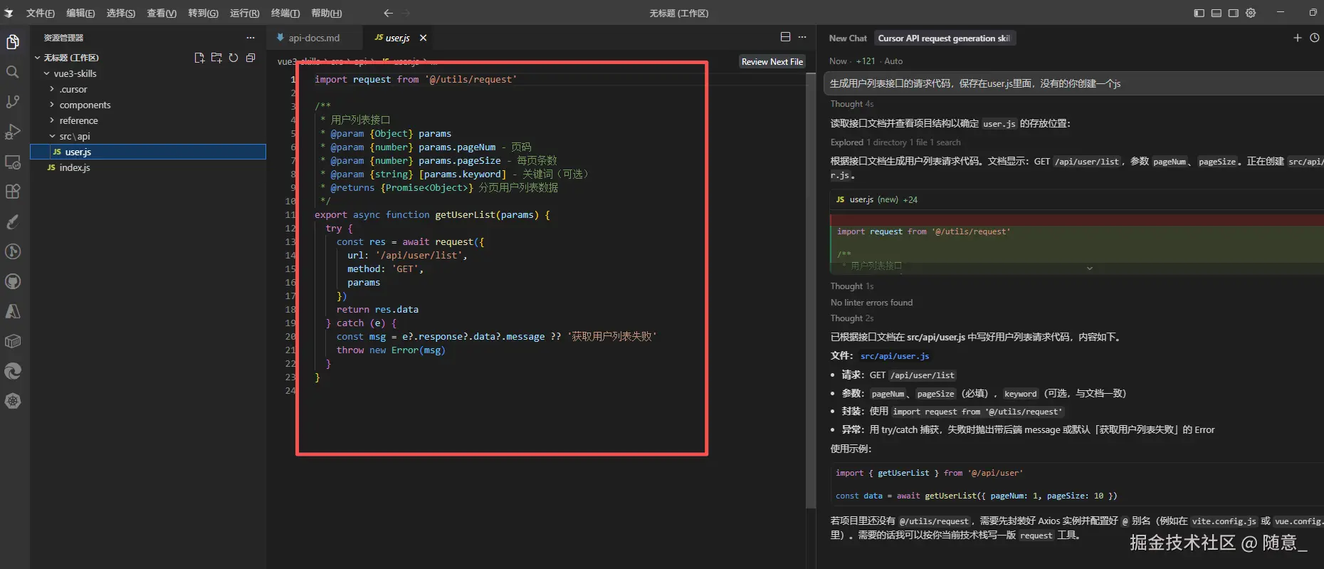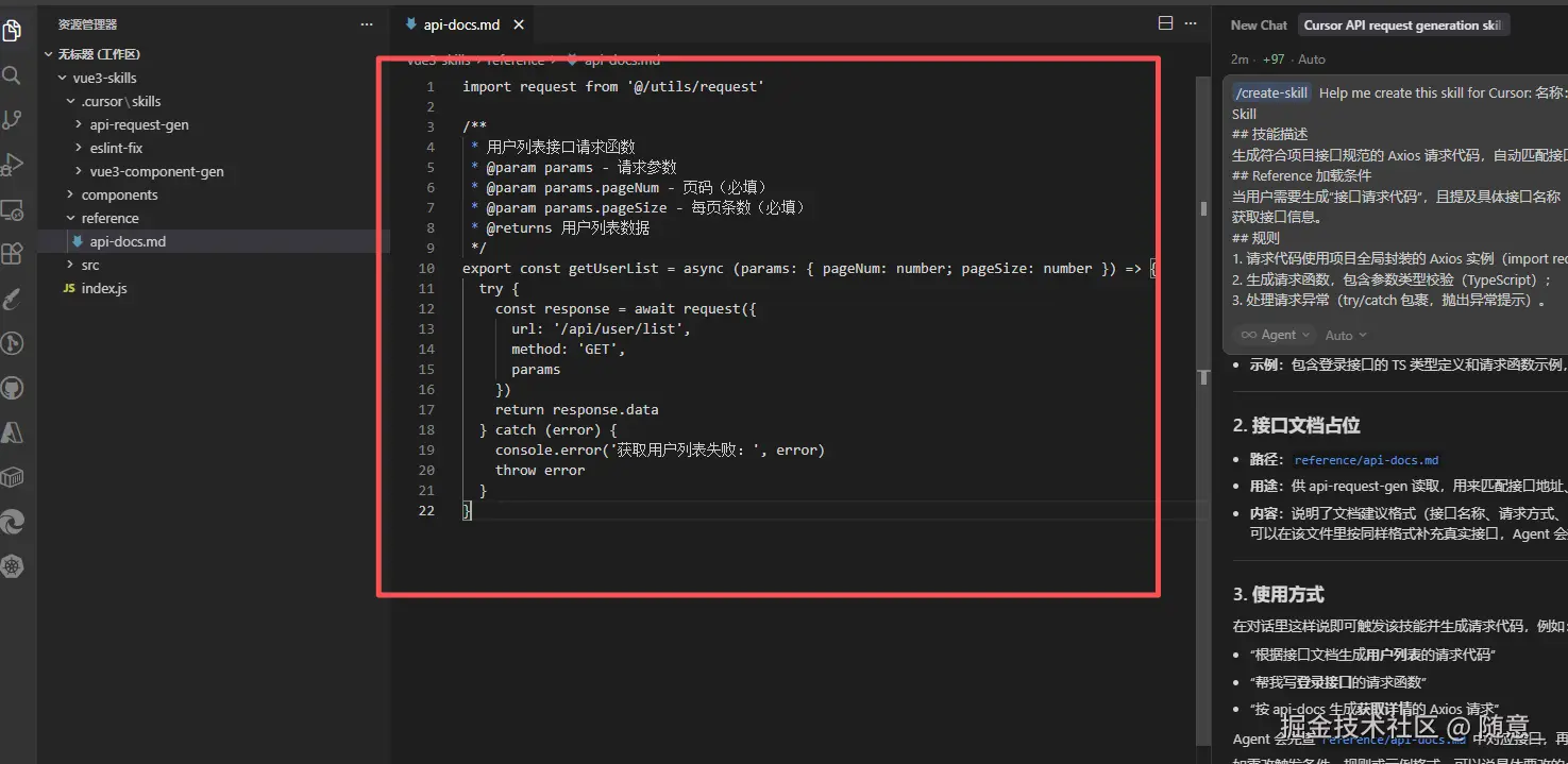 api-request-gen,创建reference子文件夹,放入项目的接口文档api-docs.md(内容示例:用户列表接口:GET /api/user/list,参数:pageNum(number)、pageSize(number),返回值:{ code: 200, data: { list: [], total: 0 } }); -