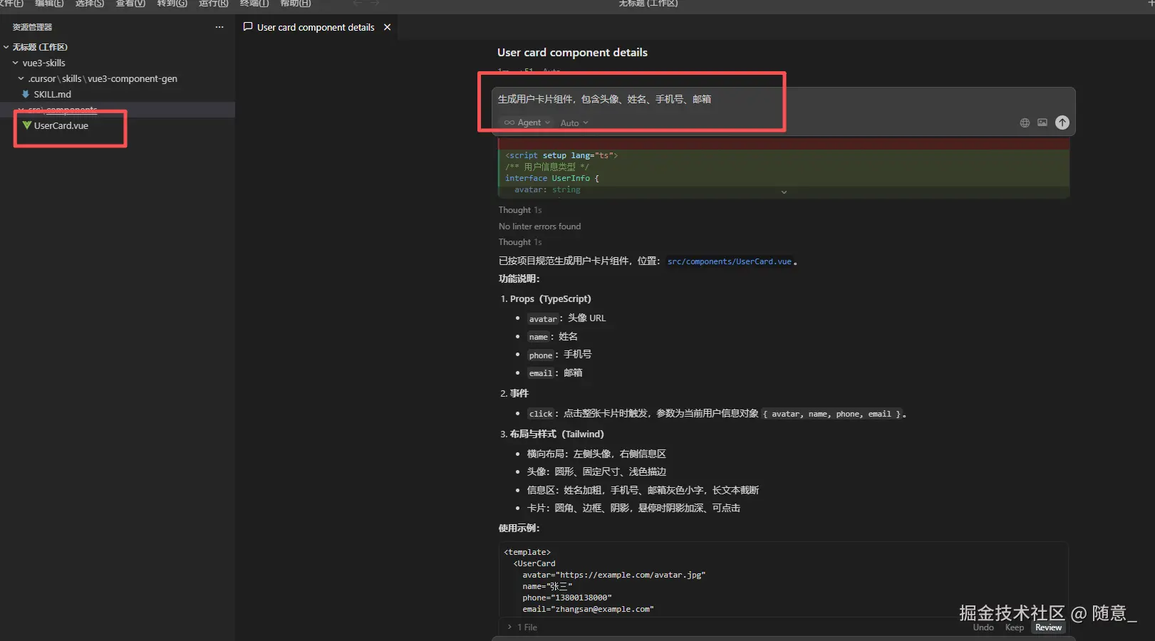 场景:前端项目中,所有 Vue3 组件都需遵循"Setup 语法糖+TailwindCSS+Props 类型校验+emits 声明"的规范,每次生成组件都要重复说明,我们通过封装 Skill 解决这个问题。
