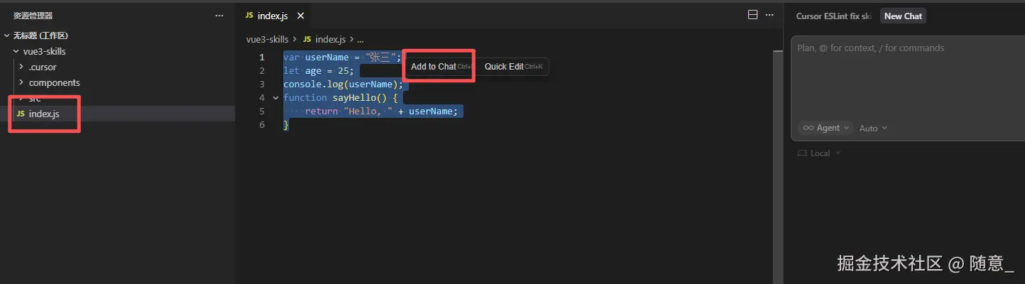 打开 Cursor 的 Agent 聊天框(Ctrl+L / Cmd+L),输入简单指令: