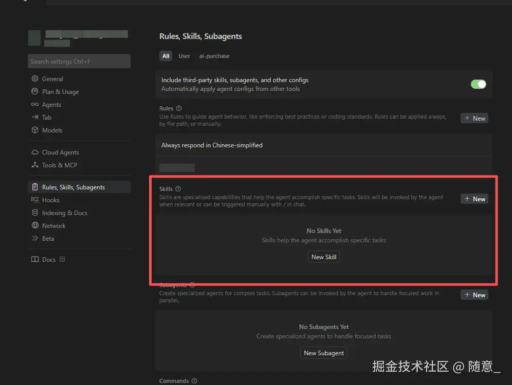 前置准备:确保 Cursor 已更新至最新版本,我是用的 目前是 2.4.28,打开 Cursor 设置(Ctrl+Shift+J / Cmd+Shift+J),开启"Agent Skills"开关(默认开启)。