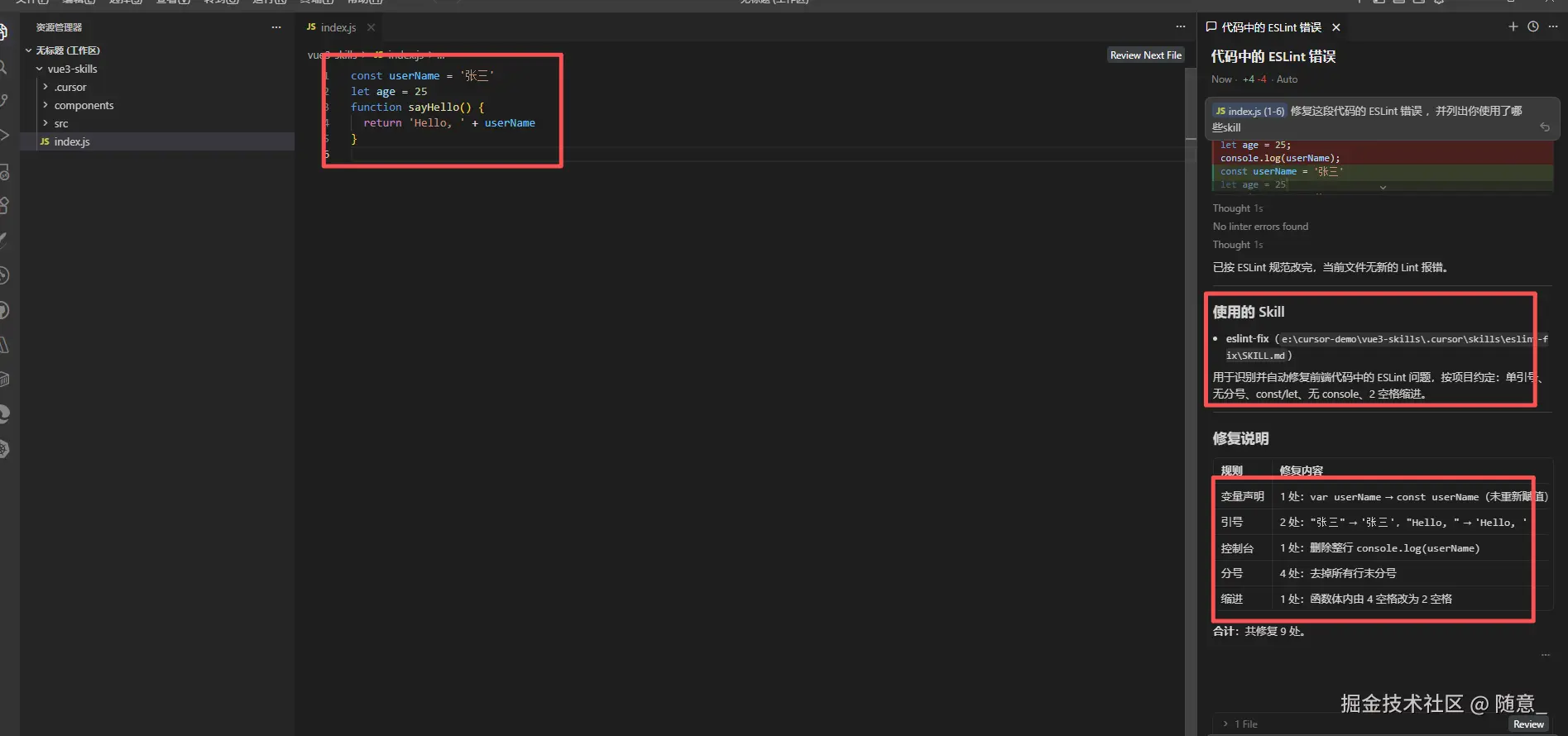 修复这段代码的 ESLint 错误 ,并列出你使用了哪些skill - Cursor 自动触发