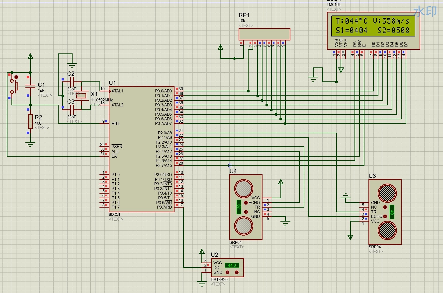 在Proteus里搭建好电路,把51单片机、超声波模块、18B20、LCD1602连接好。然后加载Keil4生成的hex文件,运行仿真就能看到LCD1602上显示实时的温度和距离了。通过仿真可以方便地调试程序,看看各个模块是否正常工作。