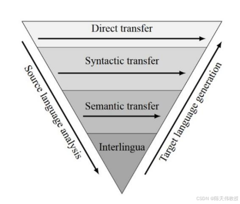 Vauquois 三角形描述的基于规则的翻译方法。(1)直接翻译:最上方的连线表示词对词的直接翻译。(2)基于转换的翻译:首先沿着左侧"源语言分析"路径对源句子进行语法分析,然后通过句法转换和语义转换,将源句子的句法和语义转化为目标语言的句法和语义,最后沿右侧"目标语言生成"路径合成目标语言句子。(3)中间语翻译:不做层层的翻译,而是将源句子直接翻译成一个"中间语言",再从中间语言转译成目标语言句子。图片来源:Schwartz et al., 2018.
