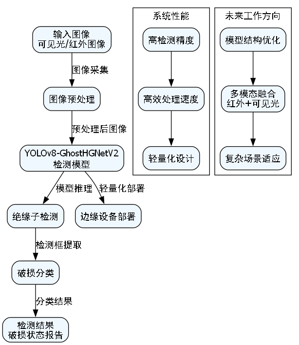本文详细介绍了一种基于YOLOv8-GhostHGNetV2的绝缘子破损状态检测与分类系统。通过模型融合、数据增强和优化技术,系统实现了高精度、高效率的绝缘子破损检测。实验结果表明,本系统在保持较高检测精度的同时,显著提高了推理速度,并大幅减小了模型大小,适合在多种硬件平台上部署。