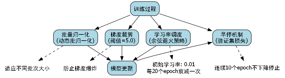 - 早停机制:验证集损失连续10个epoch不下降时停止训练