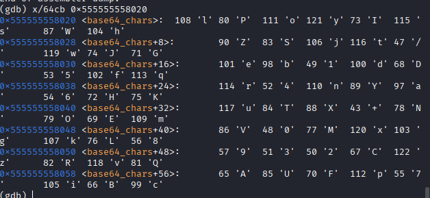 用x/64cb 0x555555558020这个命令可以看这个地址后的64个字节的内容,也就是这题用到的真正的码表