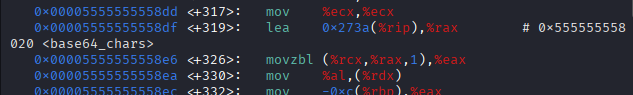 通过disassemble函数去看base64_encode的汇编代码,在这里可以看到base64_chars开始的地址