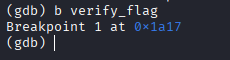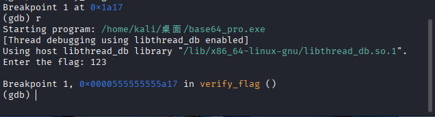使用kali的gdb进行调试,在verify_flag函数这边下一个断点,可以通过ida反编译来知道这个函数