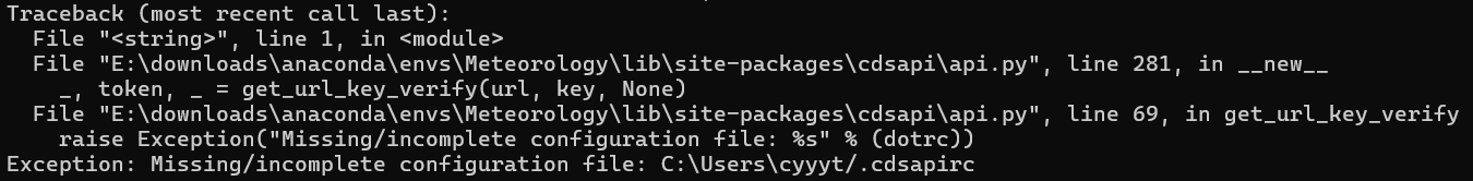 下载气象数据前先注册一个Copernicus Climate Data Store 账号,获取对应 API 密钥并进行配置,配置过程主要为:新建一个 .cdsapirc 文本文档,填入 url 及 API key 信息并保存,可以通过下面代码进行检查: