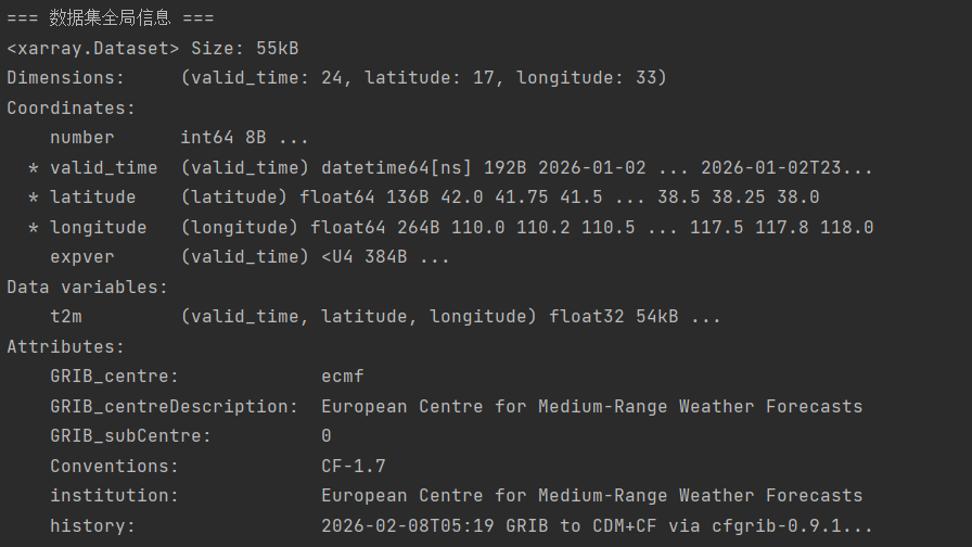 可以发现其核心变量为 t2m ,代表 2 米高处气温,数据维度包括 valid_time、latitude 与 longitude,分别表示 24 个时间点、17 个维度格点与 33 个经度格点(经纬度分辨率均为 0.25)