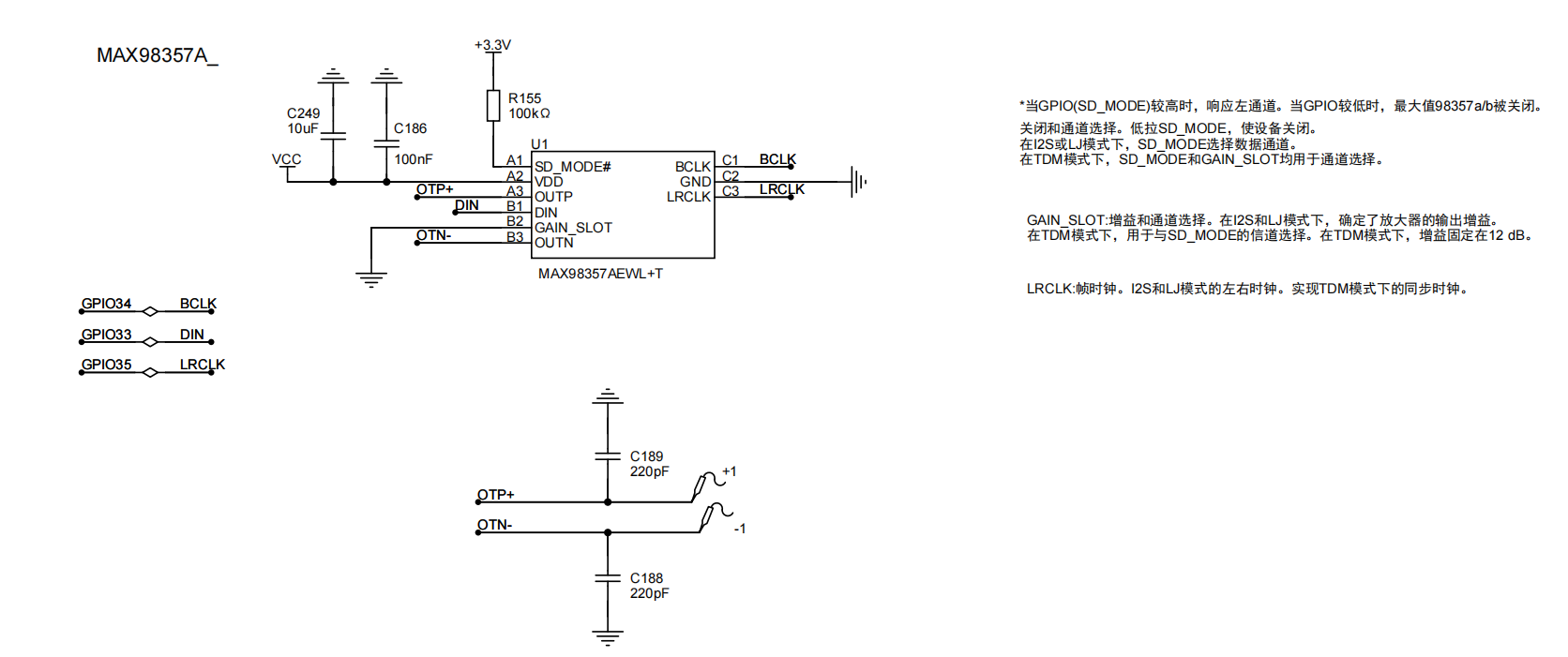 MAX98357A/MAX98357B 是 Maxim Integrated(现为 Analog Devices 旗下)生产的一款小型、低成本、数字 PCM 输入式 D 类音频放大器,具有接近 AB 类放大器的音频性能,同时具备 D 类放大器的高效率。