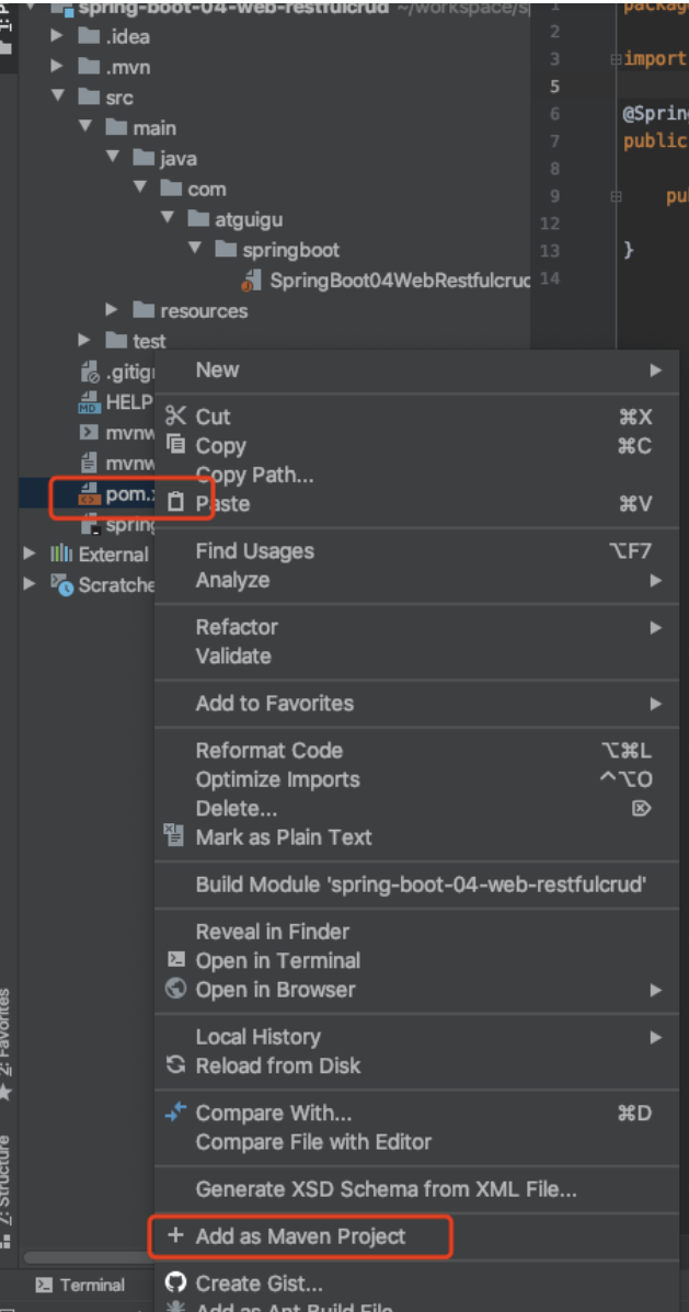 - 第二步:右键点击pom.xml,点击Add as Maven Project,待依赖导入完成后,启动按钮就出现了。