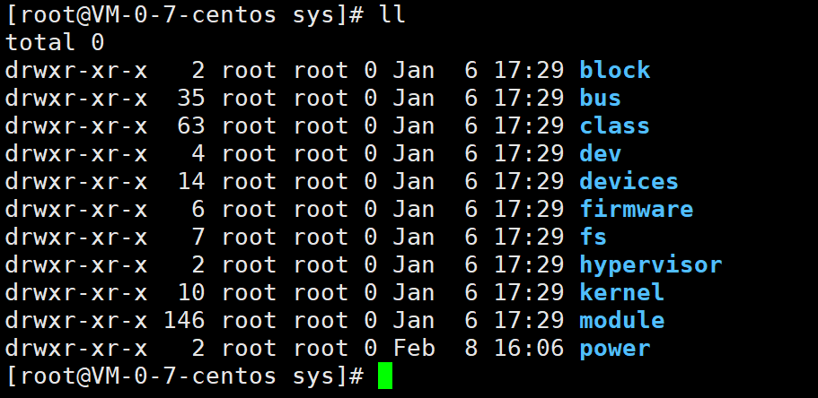 sys目录和proc目录类似,也是一个虚拟文件系统,记录与内核相关的信息,也是存放在内存,不占用磁盘信息