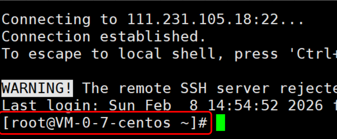 当我们连接云服务器,并以root(超级管理员)身份登录Linux系统时,命令行显示如下