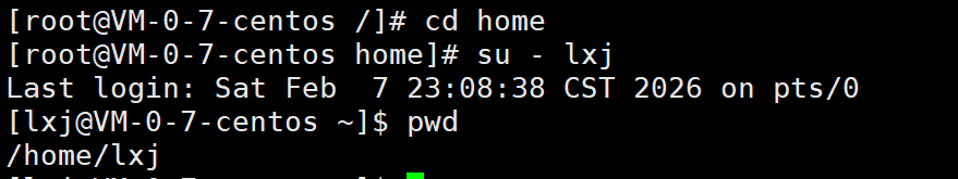 pwd展示路径,可以发现普通用户lxj的家目录就是/home下的一个目录