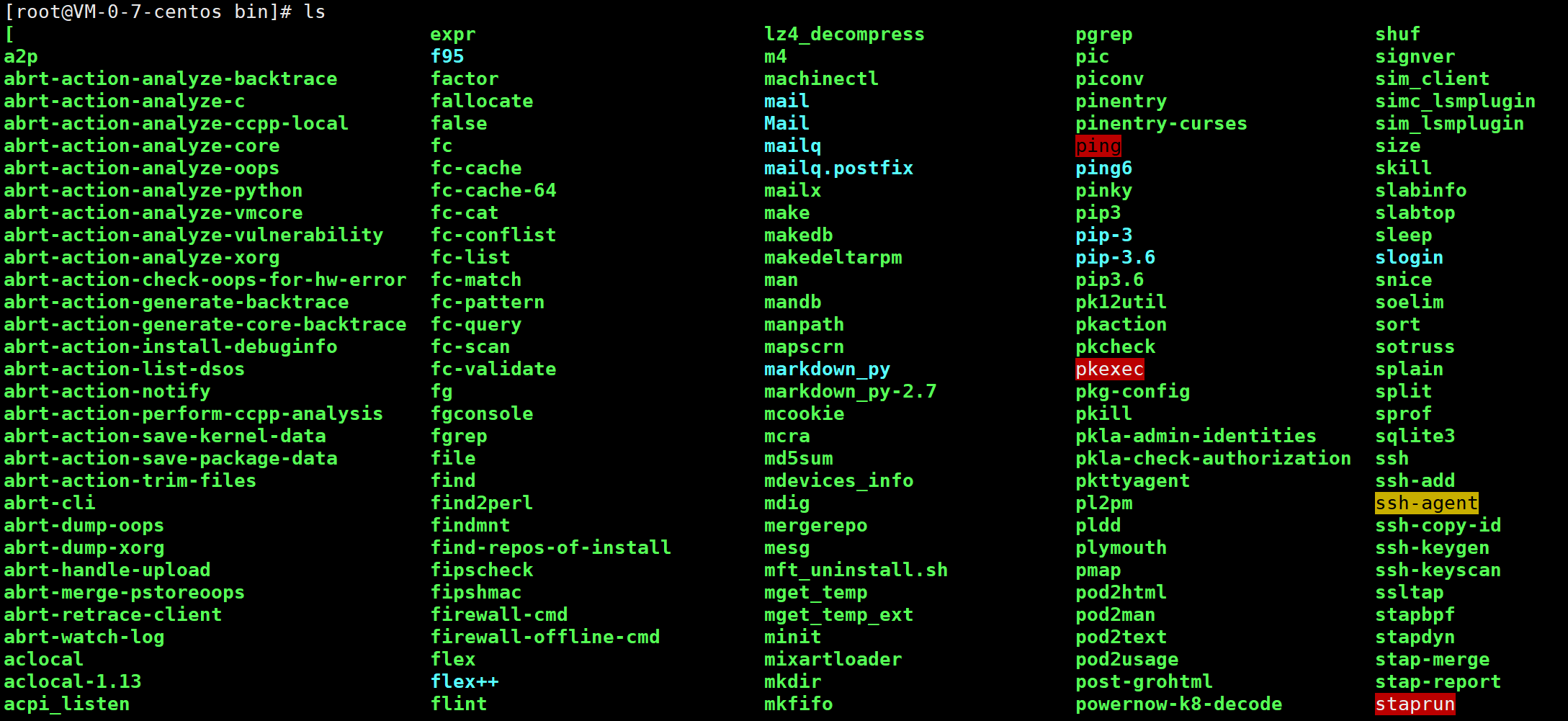 进入bin目录,展示其中的文件,可以发现一些我们使用的指令,如:man,mkdir等