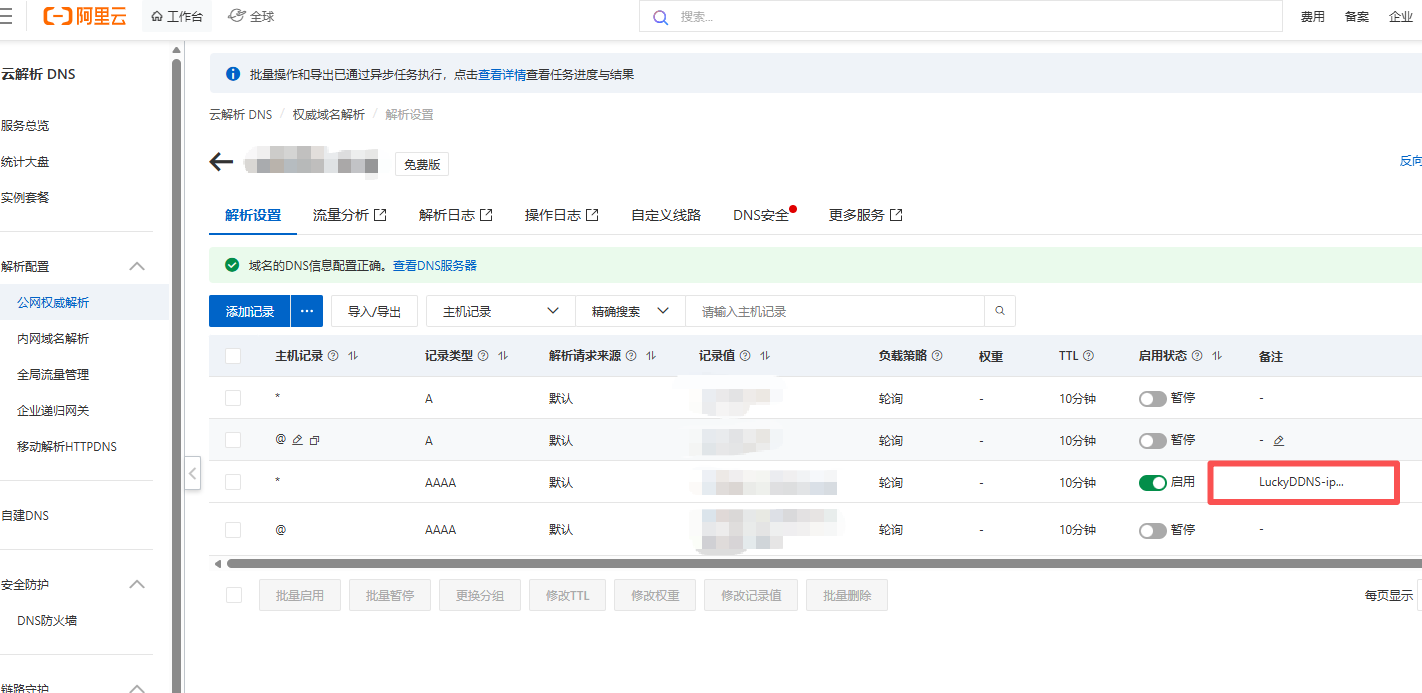 20251217\]2.19版本ddns如下:  保存后等一会,如果显示DNS记录一致那就说明成功了  点击确定,可以看到lucky生成了一条ddns任务,就说明添加成功了: 我是用的阿里云托管,因此在lucky这边添加成功后,返回阿里云的域名控制台可以看到自动生成了一个lucky的ddns配置:  ## 2. 添加ssl证书 转到**安全管理** 选项卡,并点击"**添加证书**" **添加方式**:ACME, **颁发机构:**选lets encryp, **验证方式**选你自己的托管服务商,key是和配置ddns那一步保持一致的。域名列表还是填两个,保持一致。其他的都不用管了,确定即可。  确定后稍等片刻,等证书生成,一会出现形如下边的样子,有办法时间和到期时间这种信息,就说明证书申请成功了  ## 3. 设置反向代理 转到**web服务** ,点**添加web服务规则**:  **web服务规则名称**随便填, **操作模式**就是简易模式不用动,勾上ipv6, **监听端口**就是16666默认的就行,想改的话确保别和你其他端口冲突。这个端口就是你反代走的端口。 **此处TLS必须启用**, 这样才能使用https访问。  然后点击"添加web服务子规则" 这里拿给飞牛影视做反代举例 规则名称还是随便写,方便自己区分,这里我写fntv **web服务类型**是反向代理 **前端域名/地址**:就是你从外网访问的地址,如果你的主域名是123.com,那么这里你可以写一个子域名:fntv.123.com 。注意这里不用加http头,直接写网址。 **后端地址** :就是你这个飞牛影视服务在你本地局域网的地址,假如地址是192.168.1.227:8005(飞牛影视的默认端口是8005),你就填上它,**注意此处要加http或https头** ,取决于你这个是不是强制https访问。比如你飞牛影视app上登陆时如果勾选了https,那你这里就应该写**https** ://192.168.1.227:8005.你要是写**http**://192.168.1.227:8005, 那肯定是访问不了的。反之亦然。 **basicAuth**如果勾上,那么你在连接时会额外让你输入一个用户名和密码,相当于多了一层安全保护,这个取决于个人。加不加均可。  相应的,你可以继续点击"添加web服务子规则"来添加别的服务。最后确认保存。 然后在外网试试用 fntv.123.com:16666(此处用你实际的来替换)来访问你的服务,如果反代成功就说明通了。 4. 不手动输入https 假如启用了https,在某些浏览器直接输入网址并不会自动解析成https,如果每次都手动输入https://还是略麻烦。可以进行如下设置: 新添加一个web服务规则(注意不是添加一个子规则) 选定制模式 监听地址不填,监听端口跟你反代的端口一致,注意,监听类型 你反代的那个监听类型比如只勾选了tcp6,你这里也只能勾选tcp6,即必须保持一致。 此处TLS必须关闭。  点击默认子规则,做如下设置,其他不动:  至此就配置好了。再从外网进行https访问就无需手动加https://了。 结语:至此lucky的基本配置就设置好了,至于外网访问还是要加端口号的问题(如fntv.123.com:16666),是因为大多数家庭宽带封了80/443端口,如果你幸运没封那就可以把16666改成443做反代,这样就不用加端口号了。怎么看封没封可见参考文章2:[网络千万条,安全第一条------使用Lucky轻松实现反向代理+Https外网访问家庭NAS__什么值得买](https://post.smzdm.com/p/awz4dnrk/ "网络千万条,安全第一条——使用Lucky轻松实现反向代理+Https外网访问家庭NAS__什么值得买") 本文参考: [IPv4和IPv6使用Lucky开启反向代理,申请SSL证书,开启HTTPS访问_哔哩哔哩_bilibili](https://www.bilibili.com/video/BV1HHc7e1Ede/?vd_source=80d01fdf4c7c5522984b493f34aa2c4c "IPv4和IPv6使用Lucky开启反向代理,申请SSL证书,开启HTTPS访问_哔哩哔哩_bilibili") [网络千万条,安全第一条------使用Lucky轻松实现反向代理+Https外网访问家庭NAS__什么值得买](https://post.smzdm.com/p/awz4dnrk/ "网络千万条,安全第一条——使用Lucky轻松实现反向代理+Https外网访问家庭NAS__什么值得买") [最全NAS远程访问终极方案:有公网vs没公网,一次性解决 内网穿透 IPV4\&IPV6 Cloudflare Tunnel Lucky_哔哩哔哩_bilibili](https://www.bilibili.com/video/BV1t42wBiEWd/?spm_id_from=333.337.search-card.all.click&vd_source=80d01fdf4c7c5522984b493f34aa2c4c "最全NAS远程访问终极方案:有公网vs没公网,一次性解决 内网穿透 IPV4&IPV6 Cloudflare Tunnel Lucky_哔哩哔哩_bilibili")