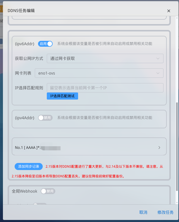 - 获取公网IP方式: 我的情况是这里获取公网IP地址的时候是通过网卡获取 ,即手动选择地址获取,因为IPV6一般会有两个用于公网的地址,一个长一个短,我一开始是"自动通过接口获取"地址,获取到的都是短的那个,然后反代一直不生效,后来我改成手动获取那个长的ip地址就可以了。(但我看别的up主就是自动获取的那个短的ip地址,就没有我的问题,这里你们自行尝试)。