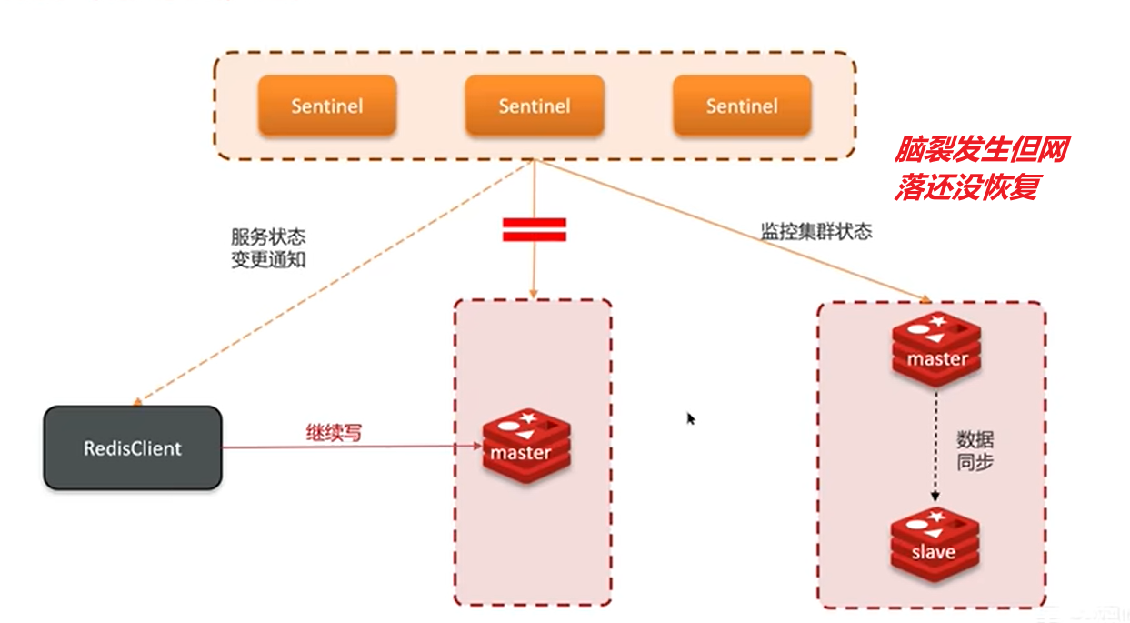 2、当网络分区发生时,哨兵集群与原主节点失去了连接,会选举一个从节点成为新主节点。此时集群中就出现了两个主节点,客户端可能会向旧主节点写入数据,而新主节点无法同步这部分数据。