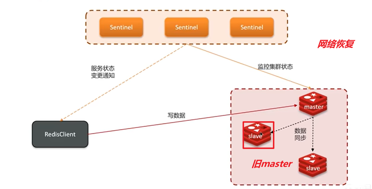 当网络恢复后,旧主节点会被降为从节点,从新主节点同步数据,这就会导致旧主节点上的新写入数据丢失。