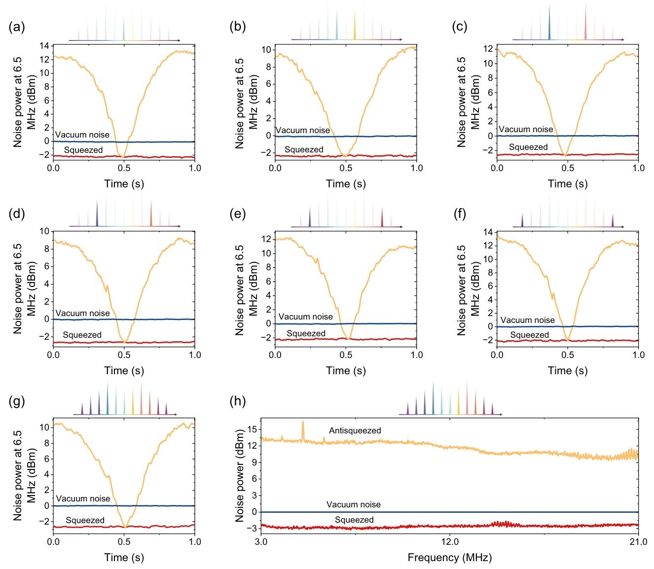 (a) 关闭所有其他梳齿,利用本地振荡器梳的中央梳齿测量中央梳齿的结果;(b) 第一个纠缠模式对的测量结果;© 第二个纠缠模式对的测量结果;(d) 第三个纠缠模式对的测量结果;(e) 第四个纠缠模式对的测量结果;(f) 第五个纠缠模式对的测量结果;(g) 开启所有纠缠梳齿的测量结果,测量得到的压缩因子为2.1-2.8分贝,反压缩因子为9.3-13.3分贝;(h) 所有梳齿同时探测时,3-21兆赫光谱范围内的压缩和反压缩水平,探测器的电子噪声比真空噪声低18分贝,分辨率带宽设置为300千赫,视频带宽设置为300赫兹。