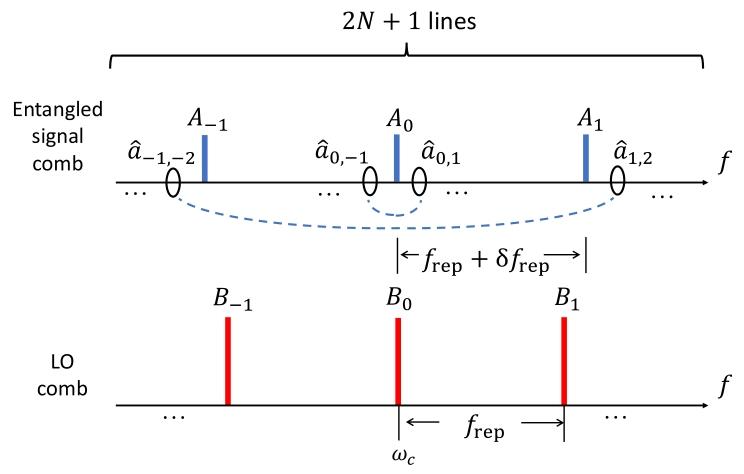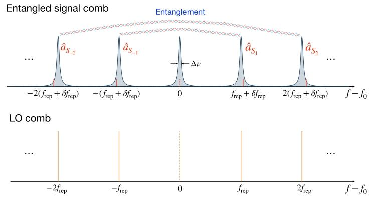 【 图9 纠缠信号梳和本地振荡器梳的频率模式示意图】