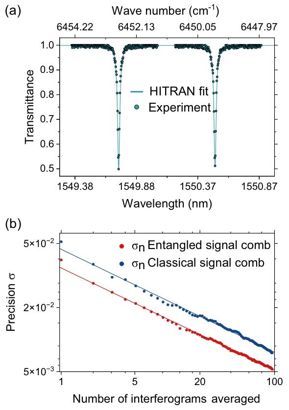 在气体探测实验中,频率偏移 δ f r e p = 4 \delta f_{rep}=4 δfrep=4兆赫的纠缠信号梳穿过含有氰化氢(HCN)的气体池,气体池的压强为25托,光程长度为17.5厘米,对应的吸收深度为3分贝。我们采用与图4(b)相同的梳结构和连续波激光器扫描方式,获取氰化氢的吸收光谱。图5(a)展示了测量得到的平均透射光谱,并基于HITRAN2020数据库[33],以光程长度、压强、温度和浓度为输入参数,采用模型对光谱进行拟合,实验数据与拟合模型具有良好的一致性。为验证纠缠双梳光谱学实现的测量加速效果,我们将透射光谱测量的精度作为平均干涉图数量的函数进行估算。利用平衡光电探测器探测干涉图,并通过具有足够带宽的示波器以100兆采样/秒的速率进行记录。滤波后,提取10微秒的时域信号段,对应分辨率带宽为100千赫的单个干涉图。图5(b)展示了测量精度随平均干涉图数量的变化关系,结果表明,在达到目标测量精度时,纠缠双梳光谱学相较于经典双梳光谱学实现了1.7倍的量子加速。这一进展凸显了纠缠双梳光谱学突破灵敏度与测量时间之间根本性权衡的潜力,为实现更高速度、更高精度的传感应用铺平了道路。