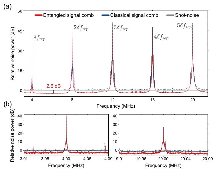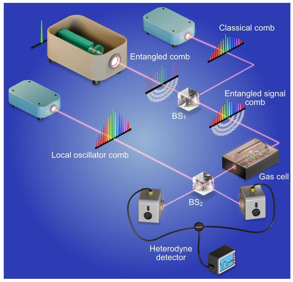1\] A. Einstein, B. Podolsky, and N. Rosen, Can quantum-mechanical description of physical reality be considered complete?, Phys. Rev. 47, 777 (1935). \[2\] E. Schrödinger, Discussion of probability relations between separated systems, in Mathematical Proceedings of the Cambridge Philosophical Society (Cambridge University Press, Cambridge, England, 1935), Vol. 31, pp. 555--563. \[3\] J. S. Bell, On the Einstein Podolsky Rosen paradox, Phys. Phys. Fiz. 1, 195 (1964). \[4\] Z. Zhang, C. You, O. S. Magaña-Loaiza, R. Fickler, R. d. J. León-Montiel, J. P. Torres, T. S. Humble, S. Liu, Y. Xia, and Q. Zhuang, Entanglement-based quantum information technology: A tutorial, Adv. Opt. Photonics 16, 60 (2024). \[5\] R. Jozsa and N. Linden, On the role of entanglement in quantum-computational speed-up, Proc. R. Soc. A 459, 2011 (2003). \[6\] A. K. Ekert, Quantum cryptography based on Bell's theorem, Phys. Rev. Lett. 67, 661 (1991). \[7\] T. C. Ralph, Continuous variable quantum cryptography, Phys. Rev. A 61, 010303® (1999). \[8\] E. S. Polzik, J. Carri, and H. J. Kimble, Spectroscopy with squeezed light, Phys. Rev. Lett. 68, 3020 (1992). \[9\] Y. Xia, W. Li, W. Clark, D. Hart, Q. Zhuang, and Z. Zhang, Demonstration of a reconfigurable entangled radiofrequency photonic sensor network, Phys. Rev. Lett. 124, 150502 (2020). \[10\] X. Guo, C. R. Breum, J. Borregaard, S. Izumi, M. V. Larsen, T. Gehring, M. Christandl, J. S. Neergaard-Nielsen, and U. L. Andersen, Distributed quantum sensing in a continuous-variable entangled network, Nat. Phys. 16, 281 (2020). \[11\] S. Hao, H. Shi, C. N. Gagatsos, M. Mishra, B. Bash, I. Djordjevic, S. Guha, Q. Zhuang, and Z. Zhang, Demonstration of entanglement-enhanced covert sensing, Phys. Rev. Lett. 129, 010501 (2022). \[12\] T. B. Pittman, Y. H. Shih, D. V. Strekalov, and A. V. Sergienko, Optical imaging by means of two-photon quantum entanglement, Phys. Rev. A 52, R3429 (1995). \[13\] N. Picqué and T. W. Hänsch, Frequency comb spectroscopy, Nat. Photonics 13, 146 (2019). \[14\] I. Coddington, N. Newbury, and W. Swann, Dual-comb spectroscopy, Optica 3, 414 (2016). \[15\] E. D. Caldwell, L. C. Sinclair, N. R. Newbury, and J.-D. Deschenes, The time-programmable frequency comb and its use in quantum-limited ranging, Nature (London) 610, 667 (2022). \[16\] M. Takamoto, F.-L. Hong, R. Higashi, and H. Katori, An optical lattice clock, Nature (London) 435, 321 (2005). \[17\] Z. Jiang, C.-B. Huang, D. E. Leaird, and A. M. Weiner, Optical arbitrary waveform processing of more than 100 spectral comb lines, Nat. Photonics 1, 463 (2007). \[18\] B. Xu, Z. Chen, T. W. Hänsch, and N. Picqué, Near-ultraviolet photon-counting dual-comb spectroscopy, Nature (London) 627, 289 (2024). \[19\] M. Walsh, P. Chang, F. Emaury, G. Rieker, N. Newbury, F. Giorgetta, S. Diddams, and J. Genest, Mode-resolved, shot noise limited, dual-comb spectroscopy with independent free running lasers, in Fourier Transform Spectroscopy (Optica Publishing Group, Munich, Germany, 2023), pp. JTh1A--1. \[20\] S. Camenzind, B. Sierro, B. Willenberg, A. Nussbaum-Lapping, A. Rampur, U. Keller, A. Heidt, and C. R. Phillips, Shot-noise limited dual-comb supercontinuum, Opt. Open 112418 (2024). \[21\] M. Tse, H. Yu, N. Kijbunchoo, A. Fernandez-Galiana, P. Dupej, L. Barsotti, C. Blair, D. Brown, S. Dwyer, A. Effler et al., Quantum-enhanced Advanced LIGO detectors in the era of gravitational-wave astronomy, Phys. Rev. Lett. 123, 231107 (2019). \[22\] Y. Xia, W. Li, Q. Zhuang, and Z. Zhang, Quantum-enhanced data classification with a variational entangled sensor network, Phys. Rev. X 11, 021047 (2021). \[23\] Y. Xia, A. R. Agrawal, C. M. Pluchar, A. J. Brady, Z. Liu, Q. Zhuang, D. J. Wilson, and Z. Zhang, Entanglement-enhanced optomechanical sensing, Nat. Photonics 17, 470 (2023). \[24\] Z. Zhang, S. Mouradian, F. N. C. Wong, and J. H. Shapiro, Entanglement-enhanced sensing in a lossy and noisy environment, Phys. Rev. Lett. 114, 110506 (2015). \[25\] A. Belsley, Quantum-enhanced absorption spectroscopy with bright squeezed frequency combs, Phys. Rev. Lett. 130, 133602 (2023). \[26\] H. Shi, Z. Chen, S. E. Fraser, M. Yu, Z. Zhang, and Q. Zhuang, Entanglement-enhanced dual-comb spectroscopy, npj Quantum Inf. 9, 91 (2023). \[27\] D. I. Herman, M. Walsh, M. K. Kreider, N. Lordi, E. J. Tsao, A. J. Lind, M. Heyrich, J. Combes, J. Genest, and S. A. Diddams, Squeezed dual-comb spectroscopy, Science 387, 653 (2025). \[28\] V. Giovannetti, S. Lloyd, and L. Maccone, Advances in quantum metrology, Nat. Photonics 5, 222 (2011). \[29\] S. Steinlechner, J. Bauchrowitz, M. Meinders, H. Müller-Ebhardt, K. Danzmann, and R. Schnabel, Quantum-dense metrology, Nat. Photonics 7, 626 (2013). \[30\] M. Chen, N. C. Menicucci, and O. Pfister, Experimental realization of multipartite entanglement of 60 modes of a quantum optical frequency comb, Phys. Rev. Lett. 112, 120505 (2014). \[31\] D. Walls and G. Milburn, Quantum Optics 2nd Edition, St Lucia, Brisbane QLD (Springer, 2011), 4072. \[32\] D. I. Herman, M. K. Kreider, N. Lordi, M. Walsh, E. J. Tsao, A. J. Lind, M. Heyrich, J. Combes, S. A. Diddams, and J. Genest, Phase-dependent squeezing in dual-comb interferometry, arXiv:2506.18698. \[33\] I. E. Gordon, L. S. Rothman, e. R. Hargreaves, R. Hashemi, E. V. Karlovets, F. Skinner, E. K. Conway, C. Hill, R. V. Kochanov, Y. Tan et al., The HITRAN2020 molecular spectroscopic database, J. Quant. Spectrosc. Radiat. Transfer 277, 107949 (2022). \[34\] A. Parriaux, K. Hammani, and G. Millot, Electro-optic frequency combs Adv. Opt. Photonics 12, 223 (2020). \[35\] X. Jia, C. Zhai, X. Zhu, C. You, Y. Cao, X. Zhang, Y. Zheng, Z. Fu, J. Mao, T. Dai et al., Continuous-variable multipartite entanglement in an integrated microcomb, Nature (London) 639, 329 (2025). \[36\] Y. Shen, P.-Y. Hsieh, S. K. Sridhar, S. Feldman, Y.-C. Chang, T. A. Smith, and A. Dutt, Strong nanophotonic quantum squeezing exceeding 3.5 dB in a foundry-compatible Kerr microresonator,