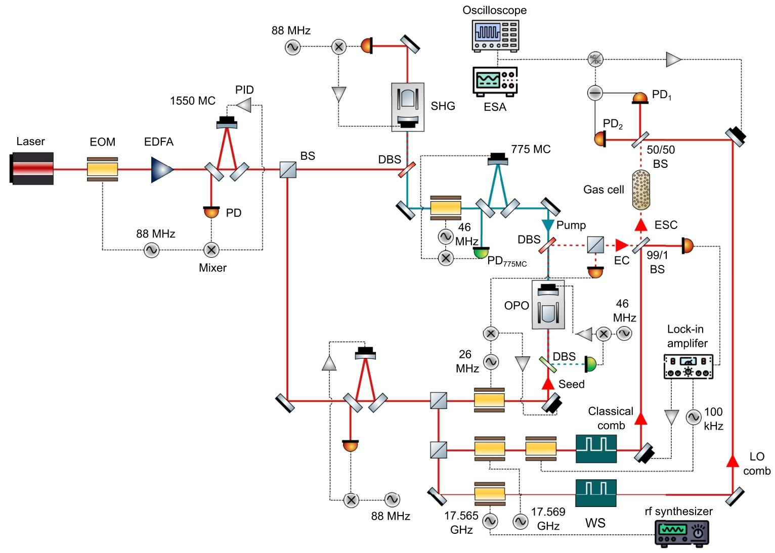 图7展示了详细的实验装置示意图。1550纳米光纤激光器(NKT Photonics Koheras BASIK)产生30毫瓦的激光,经光纤电光相位调制器调制,调制器由88兆赫信号驱动,产生边带用于通过庞德-德雷弗-霍尔技术锁定光腔。调制后的激光经掺铒光纤放大器放大至约1.5瓦,然后耦合至自由空间。1550纳米激光被导入三镜腔进行时空模式清洁,并锁定在最大透射率位置。模式清洁腔的输出分为两路:一路作为二次谐波产生的泵浦光,另一路经过第二个模式清洁腔后,再分为三路,分别作为光学参量振荡器的种子光、经典梳和外差测量的本地振荡器梳。