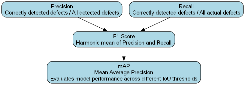 - 精确率(Precision):正确检测出的缺陷占所有检测出的缺陷的比例