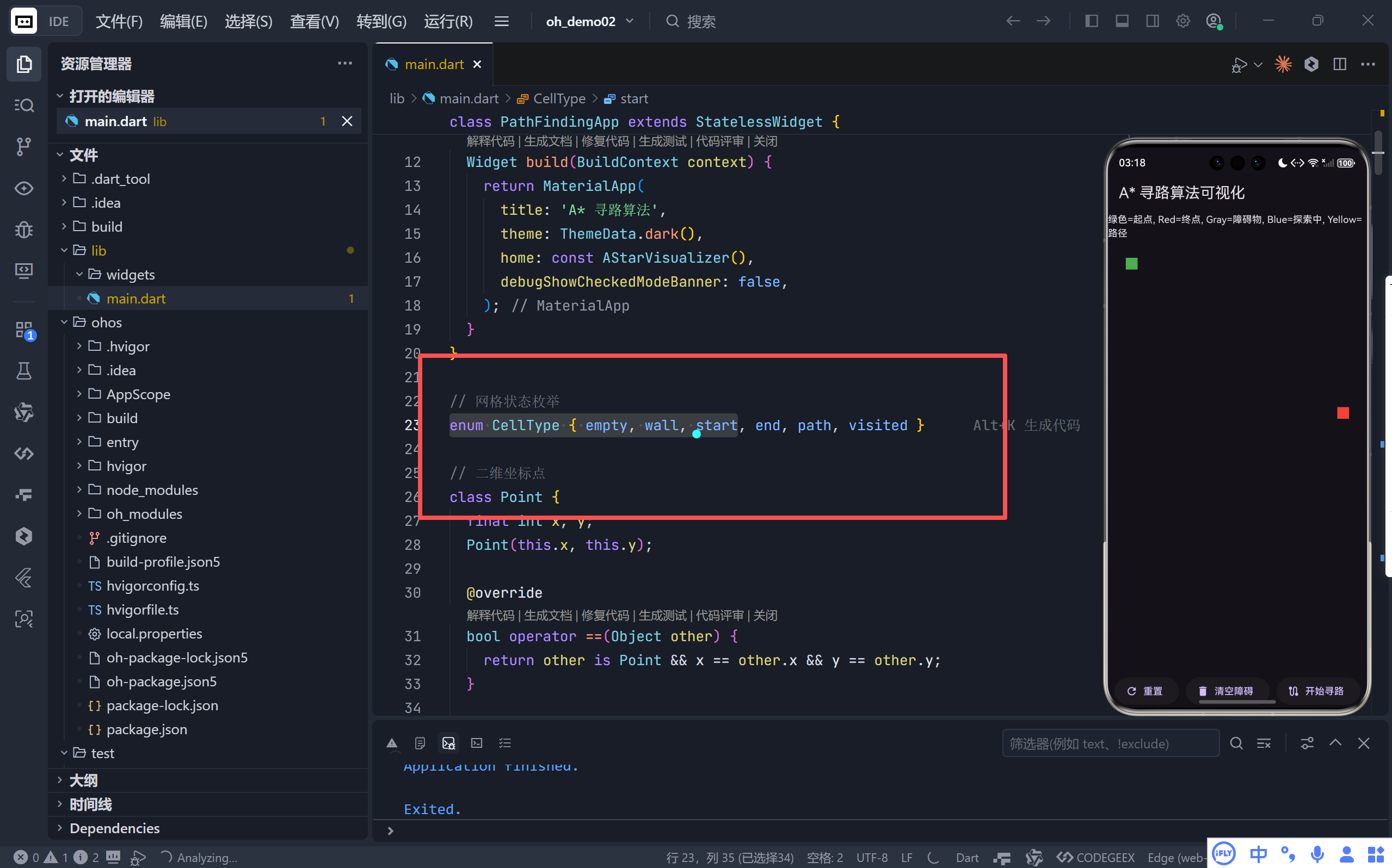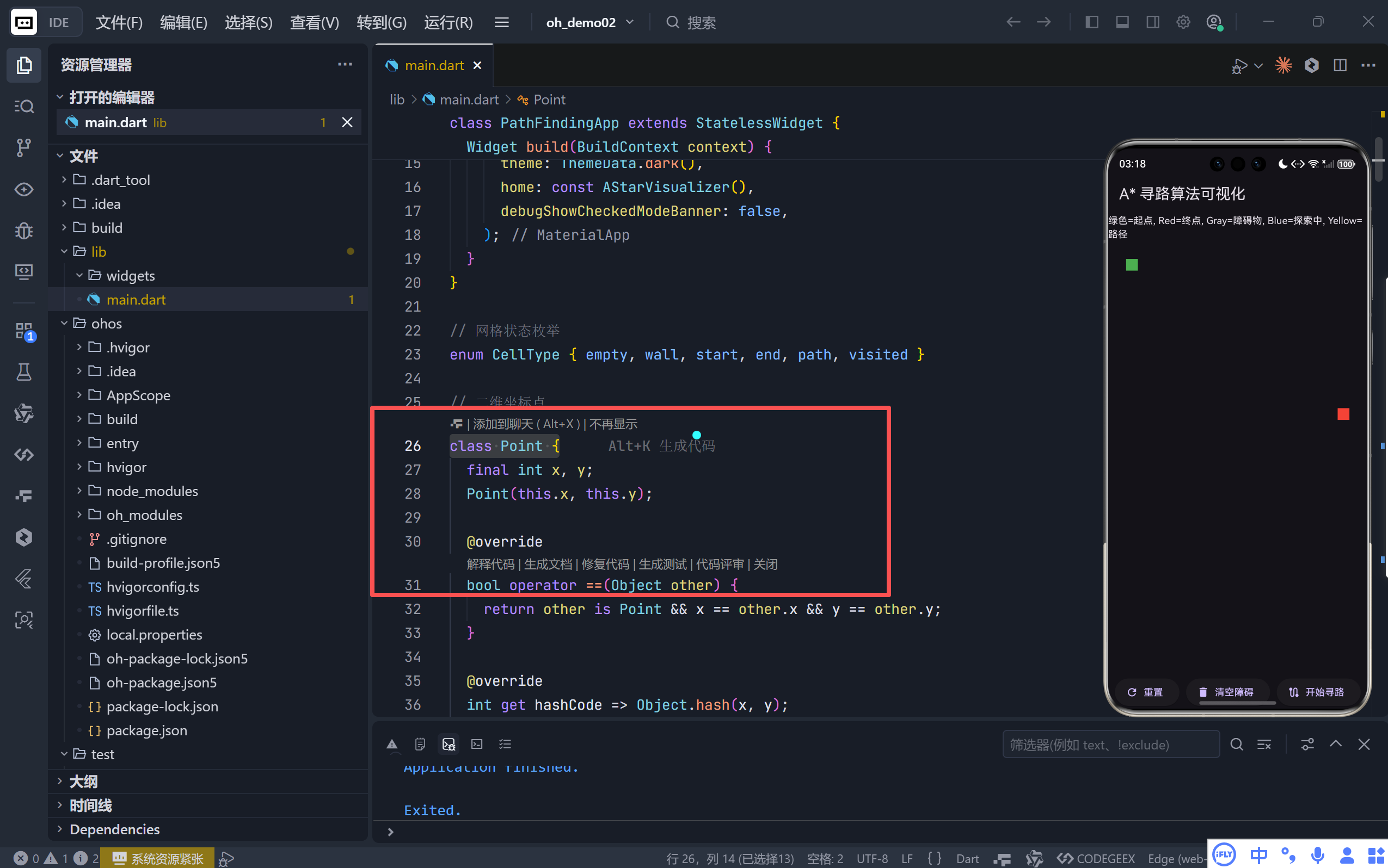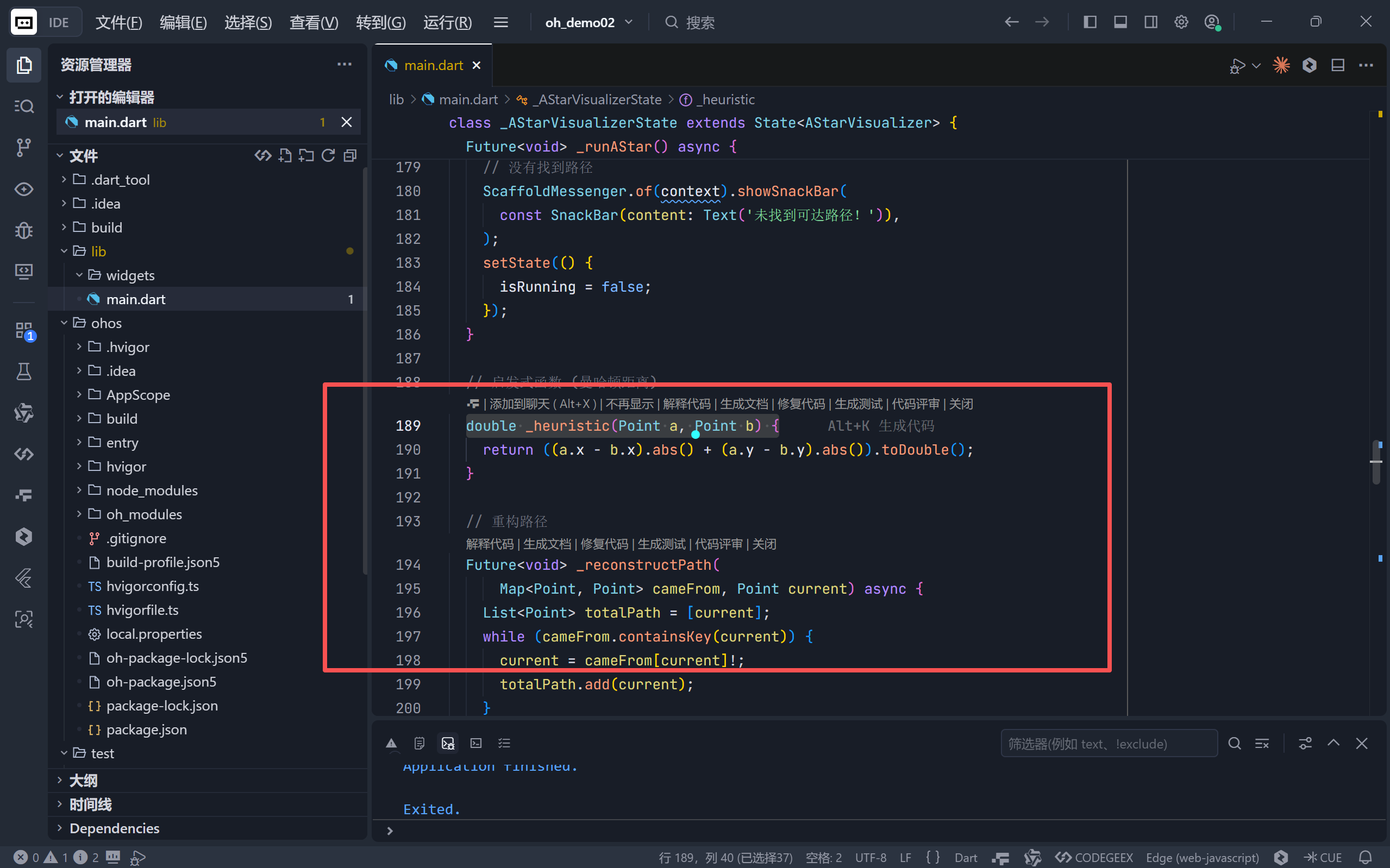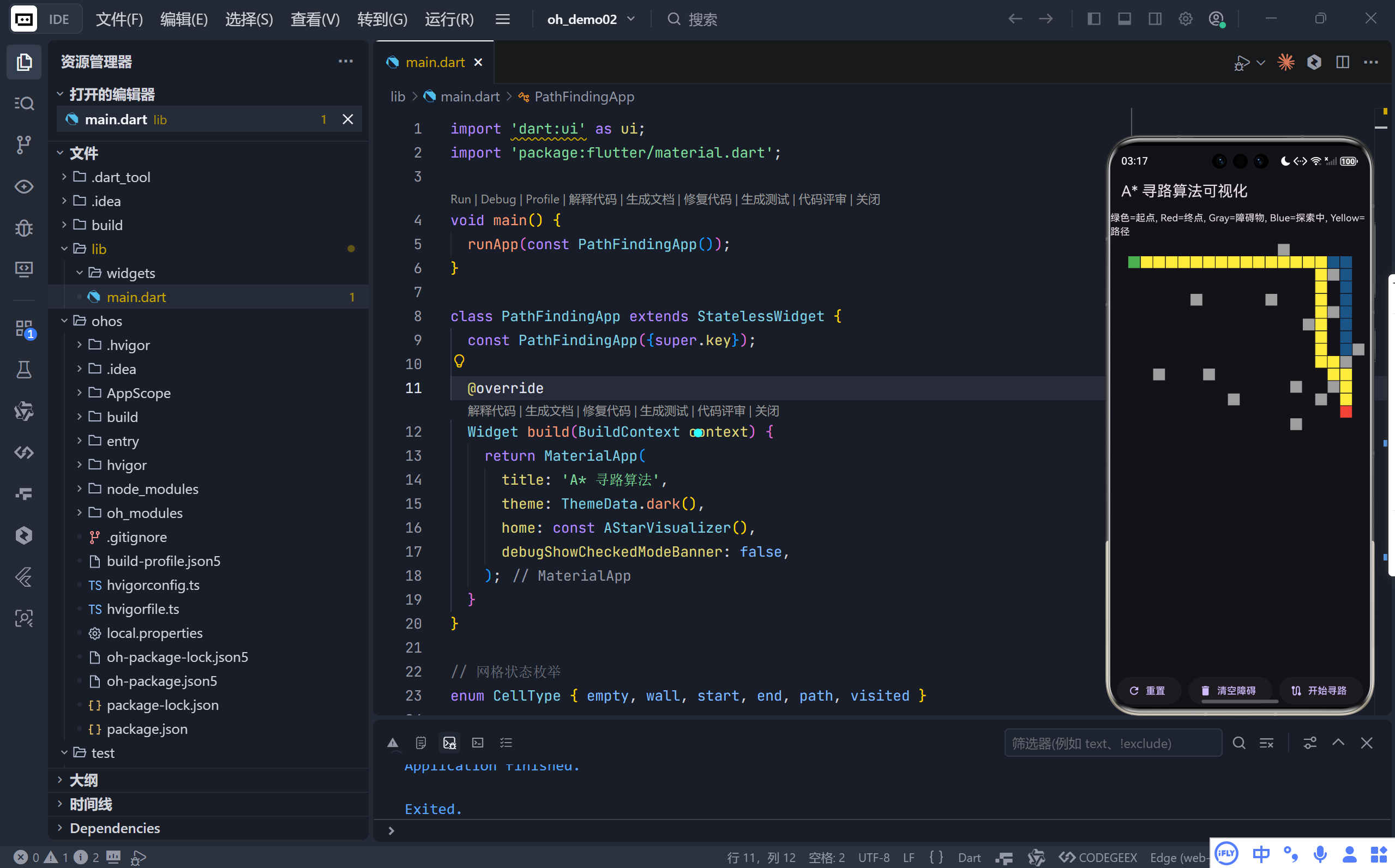 这段 Flutter 代码不仅是一个功能完整的 A* 寻路演示器,更是一个优秀的计算思维教学工具。它将复杂的图搜索过程分解为可视化的步骤,通过颜色、动画和即时反馈,极大地降低了学习门槛。