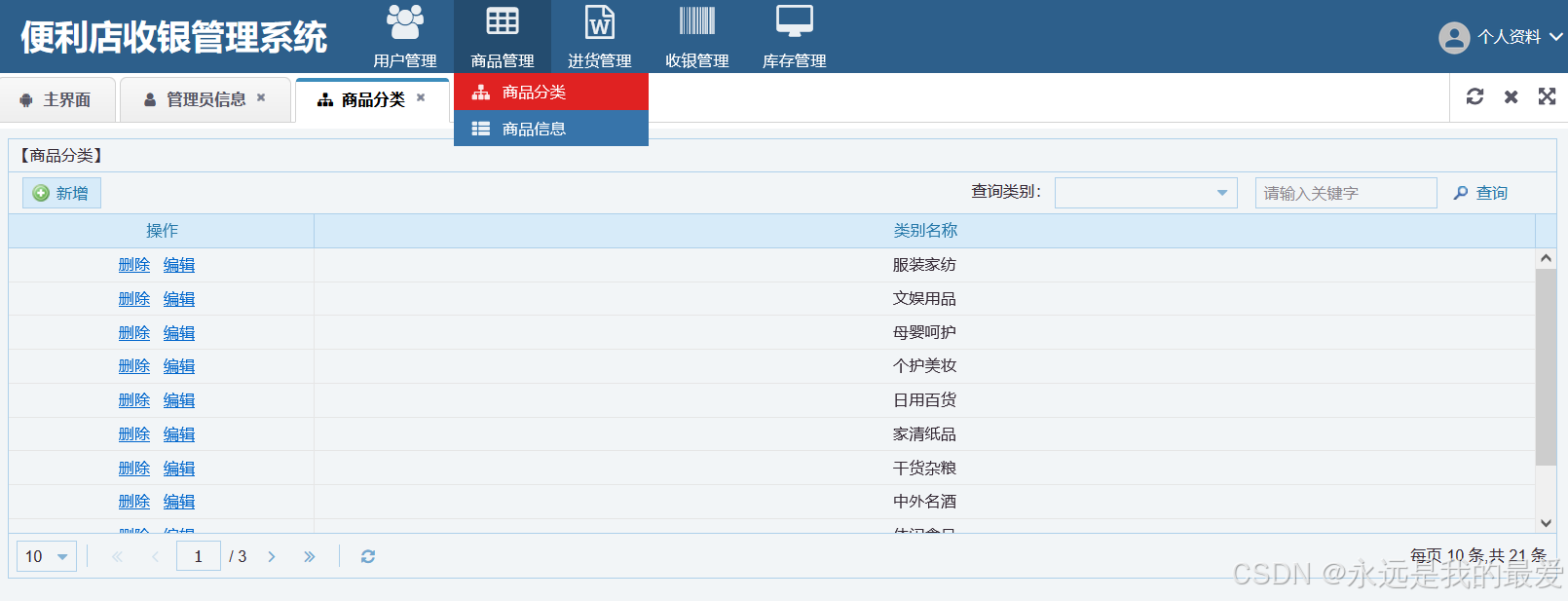 b) 商品管理:主要是针对商品分类和商品列表信息(商品图片、商品名称、商品简介、商品零售价格、商品进货价格、库存数量等基本信息)进行查询、添加、修改和删除等操作;